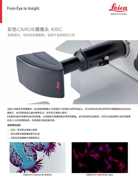 当微小的细节非常重要时,徕卡K5C显微镜摄像头为您提供了发现微小细节的能力。作为材料和生命科学研究专家需要的彩色CMOS摄像头,徕卡K5C显微镜摄像头可帮助您以高分辨率区分、研究和记录微小细节。