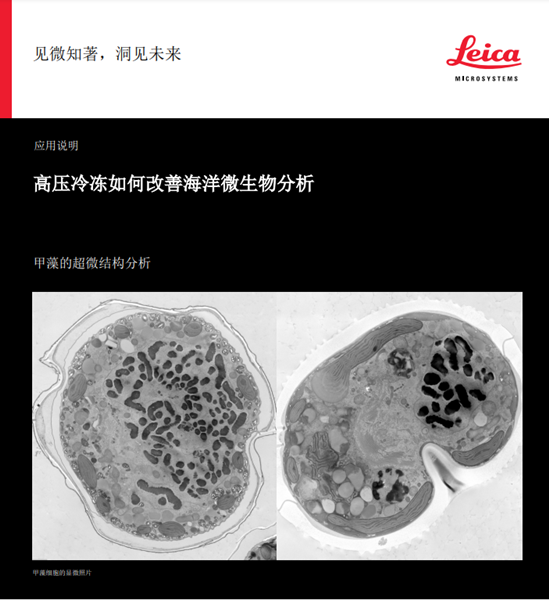 这些甲藻使用特殊拖网(网孔尺寸为5或10μm)在法国滨海自由城(Villefranche-sur-Mer)湾的地表水中,以10分钟的慢速拖曳收集。在船上收集到样品之后,使用一系列分析筛(来自Retsch)收集尺寸低于40μm的甲藻细胞。在实验室中,此粒径组分:1)以手动泵压的方式,使用1.2μm的混合纤维素酯膜(来自Merck)过滤浓缩:2)重悬为最终体积为4ml的液体:3) 以1000g的离心力,离心处理5分钟。去除上清液,将大约1.2μl的沉淀物包埋到预涂十六烷烯(来自Merck)的A型铜镀金载体(徕卡:200μm深,3mm宽)。使用预涂十六烷烯(来自Merck)的铝质B型载体(来自徕卡),将表面平坦一侧盖在样品上,然后使用Leica EMICE进行高压冷冻。