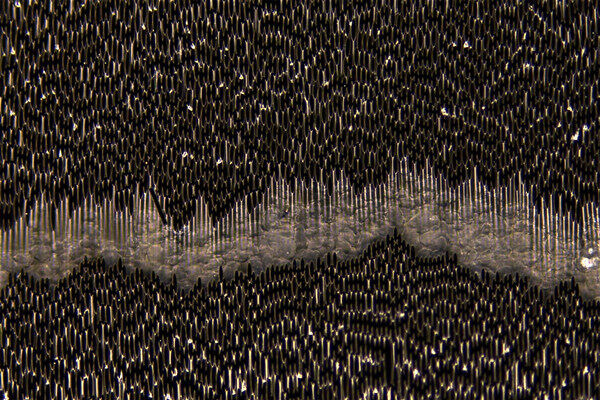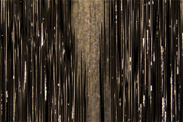 作品介绍:格林森螺旋齿轮试验后轮齿表面发生胶合流变,用4%硝酸酒精腐蚀后,胶合流变部分形似一条龙腾云而起,遨游天际。