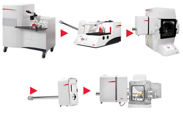徕卡显微系统自然也开始着手实现 EM 样品制备系统的连接性能,保证在到进入分析系统之前的整个工作流程中全程保护您的样品。
