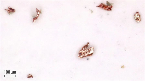 使用徕卡复合显微镜和 Cleanliness Expert 软件进行分析的滤光片上铜(Cu)颗粒的图像。