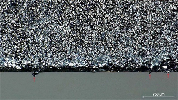 电池电极片边缘毛刺(用红色箭头标记使用 DVM6 数码显微镜拍摄的图像)。
