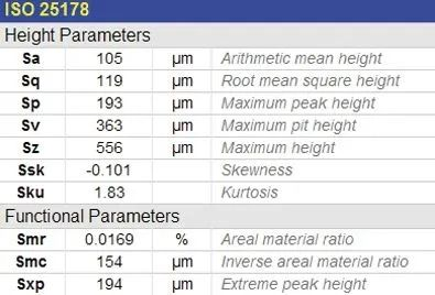计算ISO 25178粗糙度参数(Spd、Spc、S5p、S5v、S10z、Sha、Sda、Shv、 Sdv),并在摩擦学研究中应用Spd(峰值密度)和Spc(算术平均峰值曲率)参数,例如塑性和弹性